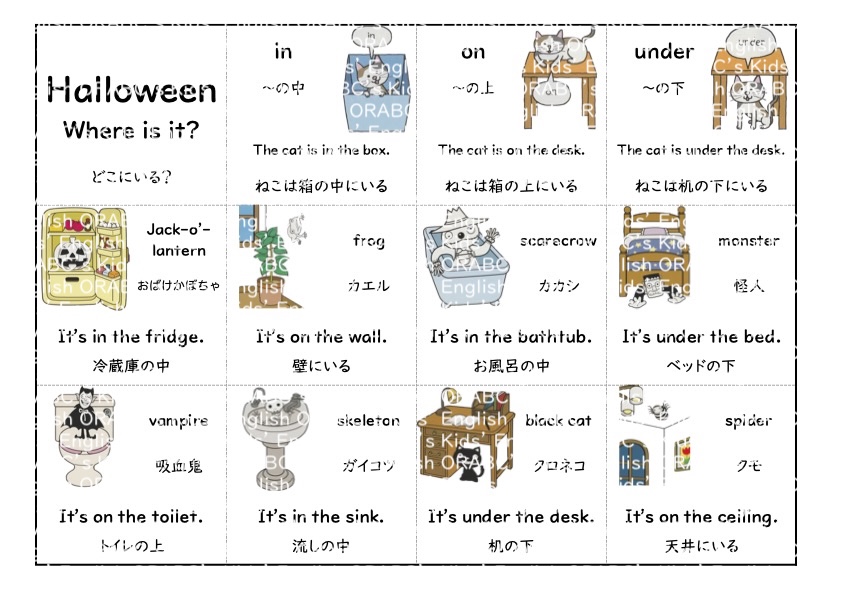 ハロウィンのキャラクターを使って場所を表現しましたよ。
